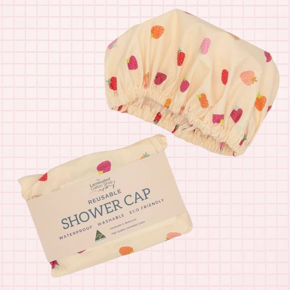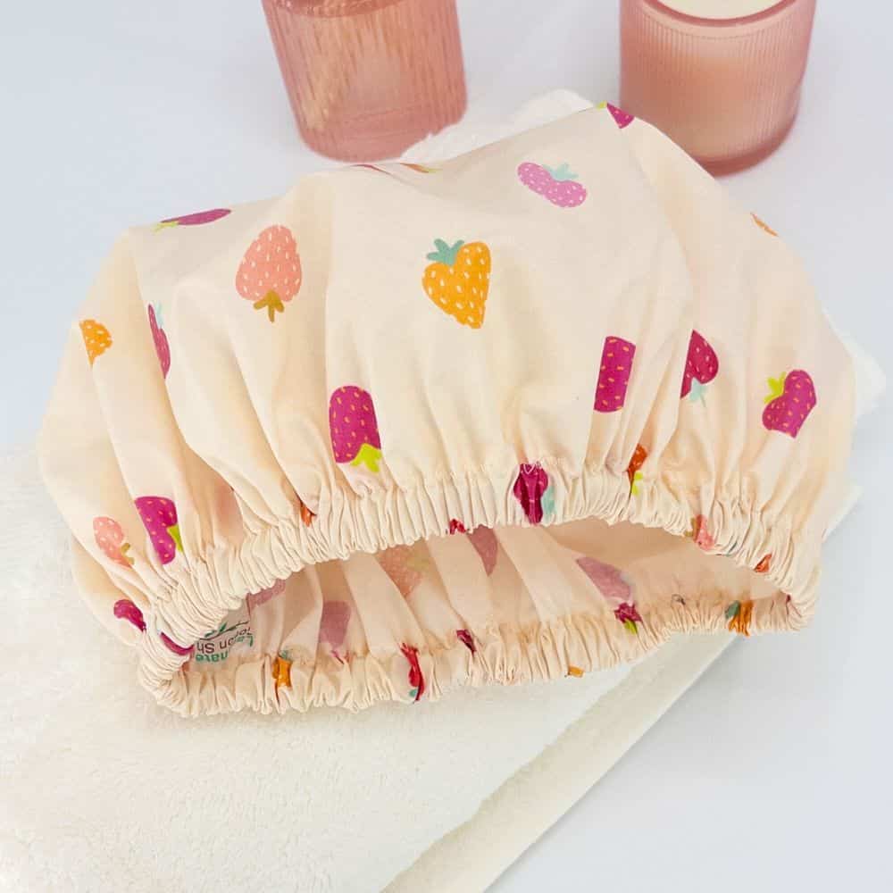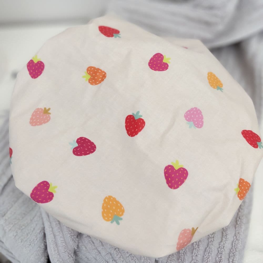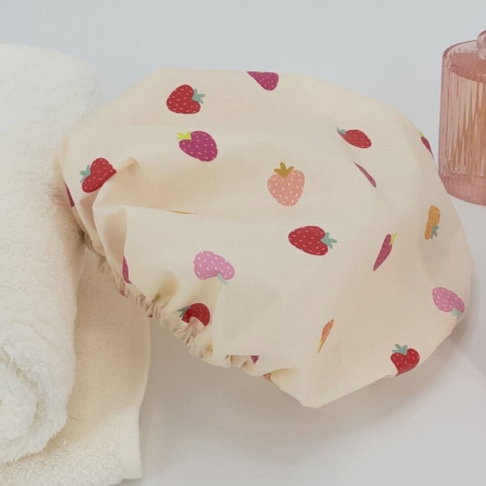Shower cap in cute strawberry  print on a cream background . Waterproof and machine washable shower hat.